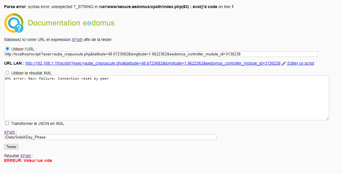 Par contre depuis octobre ma règle ne fonctionne plus car le module soleil étendue a une erreur. Lorsque je creuse un peu cela semble venir du xPath et lorsque j'utilise le bouton test j'ai ERREUR: Valeur lue vide