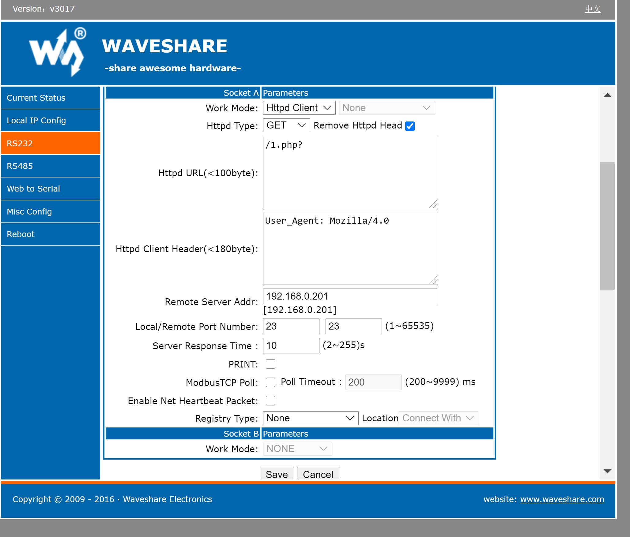 Sauf si je choisi HTTPD cLIENT, j’aurai pour les autres en bas de page une option pour le SOCKET B avec un mode : NONE ou alors UDP CLIENT ou TCP CLIENT