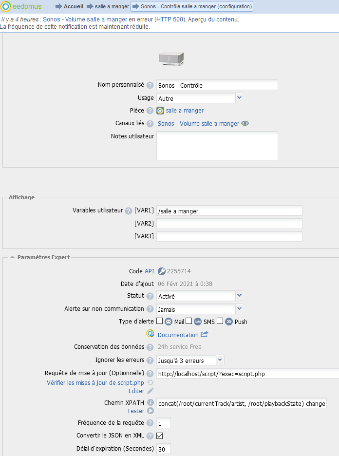 et en VAR1 tu dois avoir le nom du local tel qu'indiqué dans l'application sonos (je suis surpris de voir un "/" dans le nom que tu as mis, mais bon, si c'est sur sonos.)