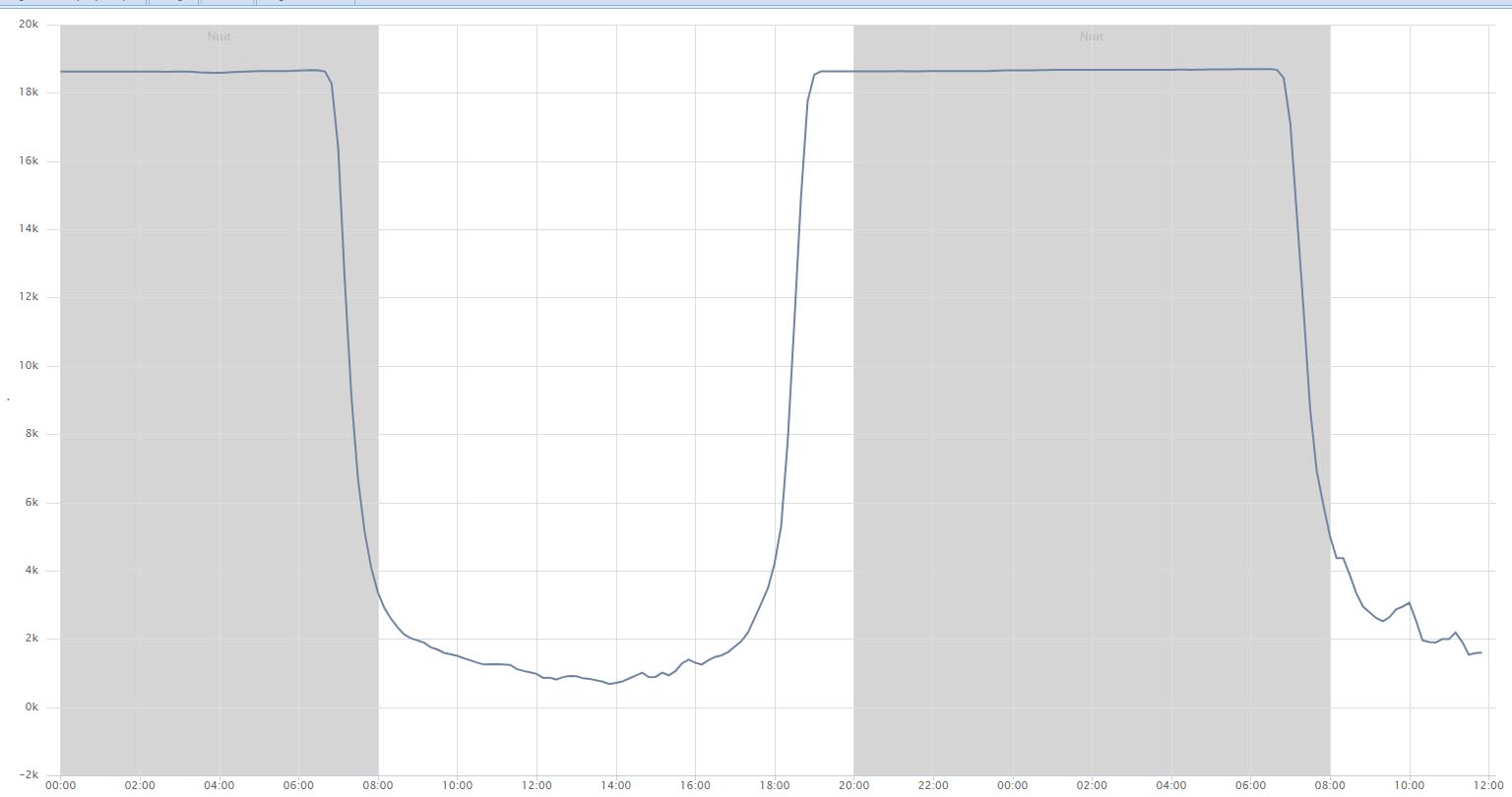 En pleine nuit, je tourne entre 18000 et 19000 (à cause de l'éclairage public je pense, le capteur est sur mon toit, maison de plain-pied). Cependant, je trouve que ma courbe est assez extrémiste.