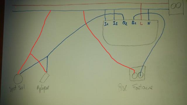 comme vous le voyez, il manque i2 et i1 sur lesquel, si je comprend le schema, je devrais mettre 2 cables bleus, sauf que mes cables sont des cables triples (avec du rouge et jaune). Comme je n'ai pas envie de tirer un autre cable (pour des raisons pratiques et économiques), je voulais savoir si cela fonctionnait en mettant les câbles rouge sortant des prises et spots. je sais que ca n'est pas orthodoxe pour un elec mais la question est : est ce que mon schéma fonctionnerait, ce qui, dans l'absolu, ne met que du cable bleu a part l'alimentation du qubino double en rouge.