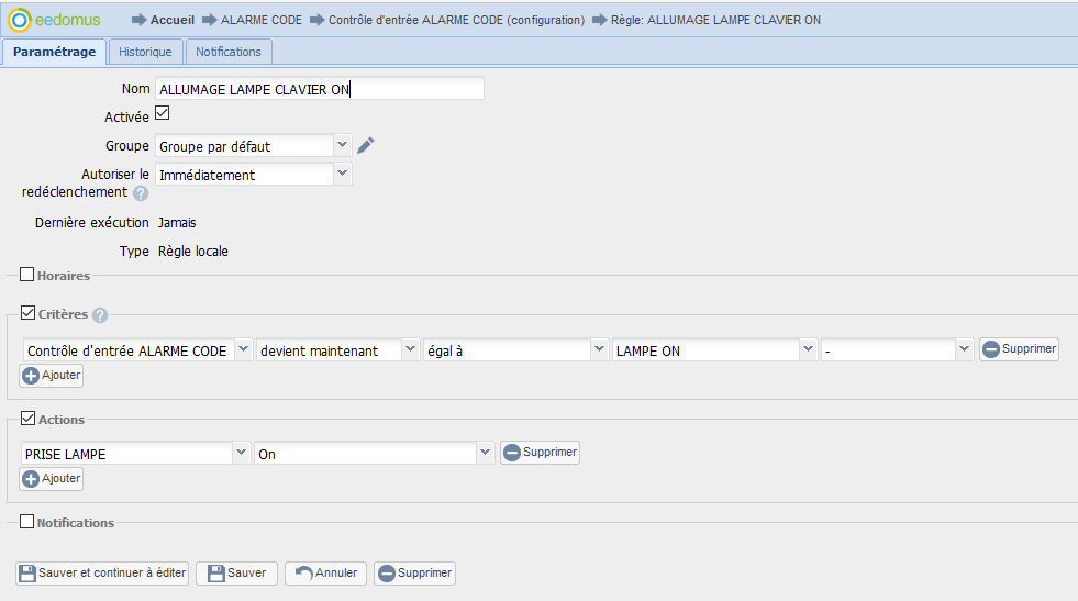 Bien sur pour la éteindre la lampe j’ai placé la même règle mais « lampe OFF » et « valeur brut » 3232323200000000