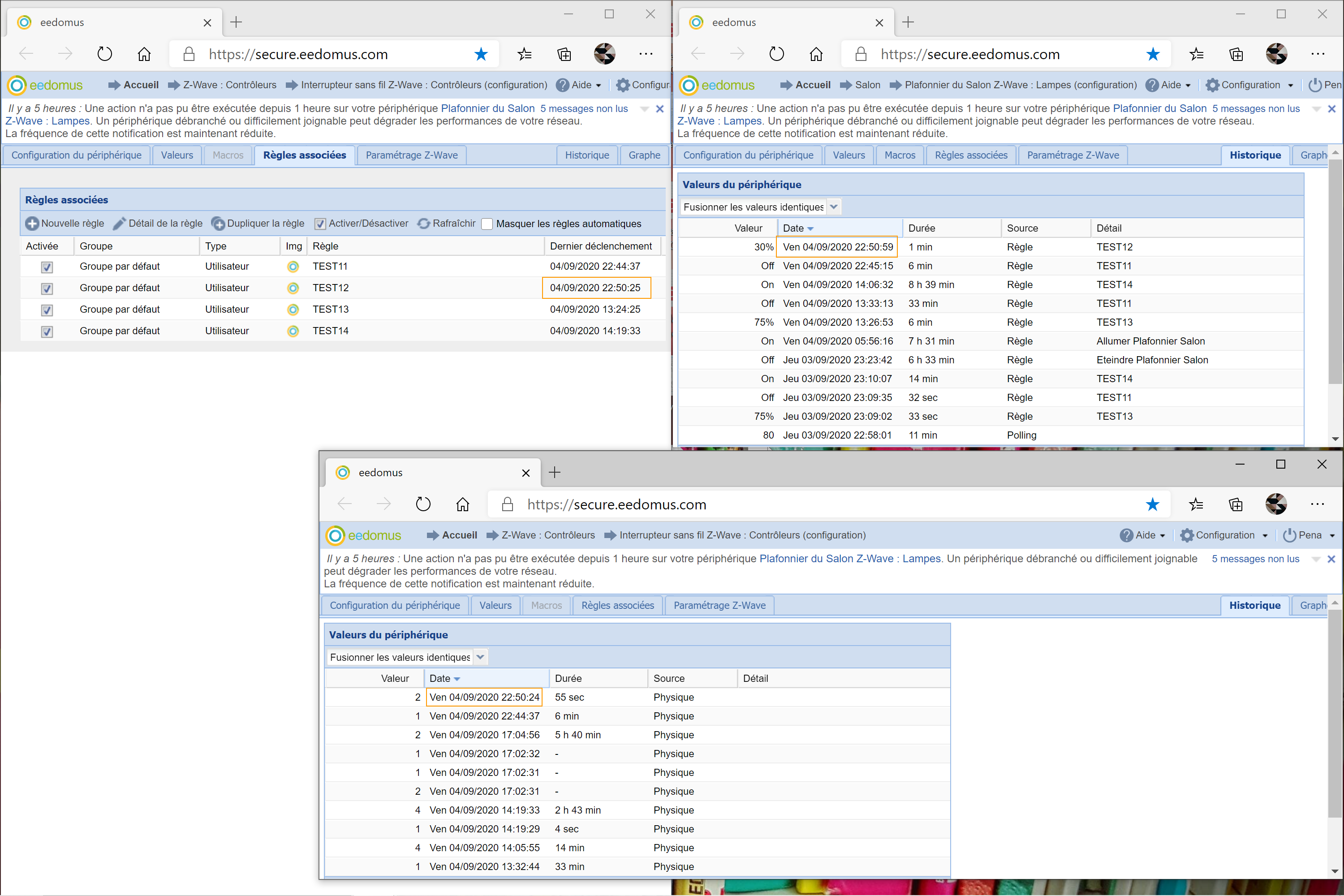 J'ai aussi remarqué que de leur propre initiative, les virtuels liés à des zwaves repassent seuls à la valeur 1. Quand j'appuie sur le 2, on voit dans l'historique qu'ils passent immédiatement à 2 (1 secondes avec une source "règle", l'action liée ne se lance pas, ils repassent ensuite en 1 (source "calculé") puis bien plus tard, ils reviennent en "2" (source calculé) et là, l'action se fait...
