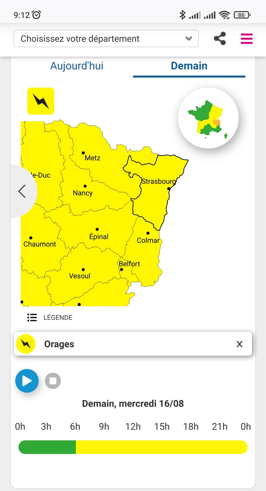 Transition toute faite pour savoir et demander s'il est possible d'ajouter l'info de début de période de risques sur "vigilance jour" car si l'on voit bien l'heure de fin (en TU), l'heure de début du risque est inconnue hormis de consulter la carte sur le site de MF. Le risque apparait dans l'appli des lors que le risque est publié sur le site de MF même si cela est 6h avant le dit risque.