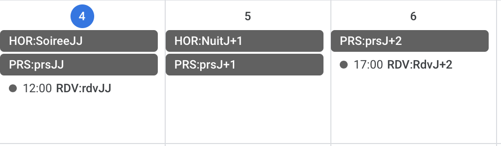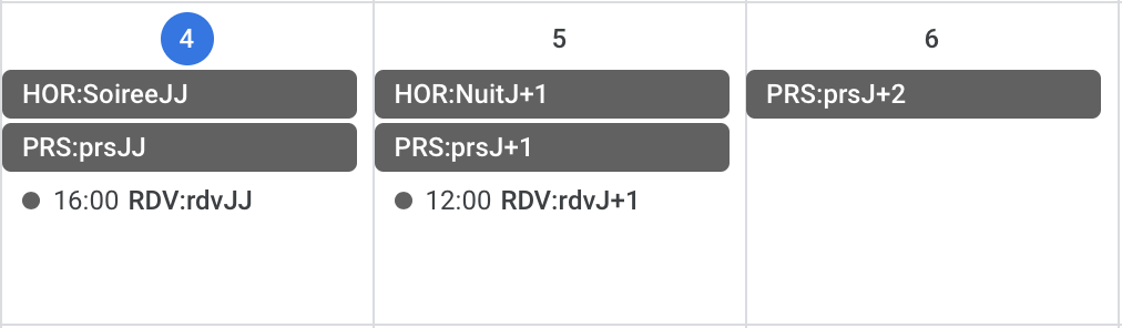 // Un seul calendrier Gmail est suffisant contenant tout ce que l'on veut gérer.