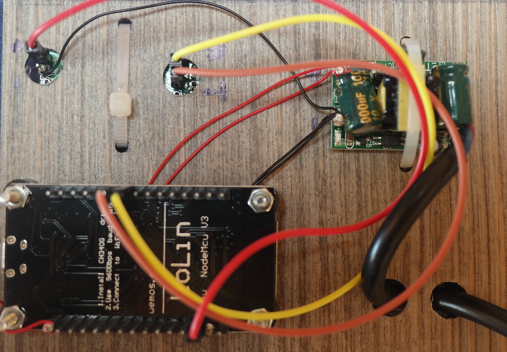 Attention, on « joue » quand même avec du 220V, donc prenez toutes les dispositions de sécurité nécessaire. Si vous préférez, vous pouvez alimenter le tout par le connecteur USB du ESP8266, pour éviter le transfo et toucher au 220V (voir mon tuto sur l’automatisation d’une porte de garage).