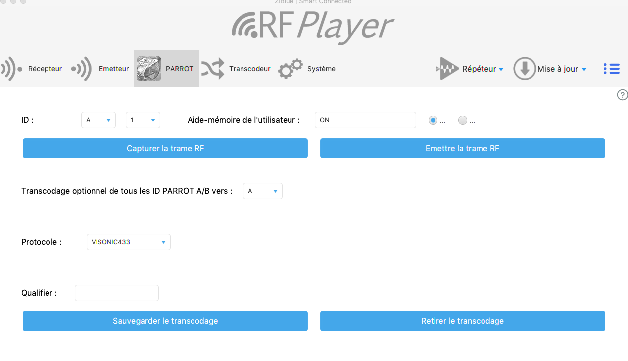 Je clique sur capturer la trame, le Rfplayer clignote bleu rapide, faire un bref appui sur la télécommande, vous avez un led bleu faible fixe (le code a été reconnu), refaite un bref appui, vous avez une led Violet puis plus rien votre Parrot a été enregistré.